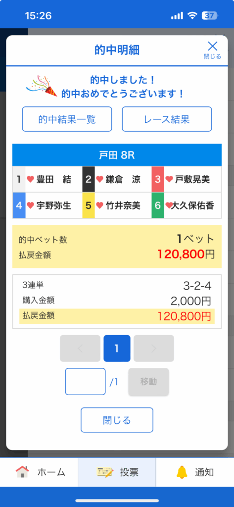 今回は2,000円賭けていた、3-2-4の倍が60.4的中したから120,800円の払戻を獲得!