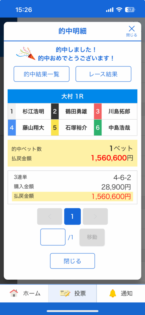 今回は28,900円賭けていた、4-6-2の54倍が的中したから最終的な払戻金額は1,560,600円!
